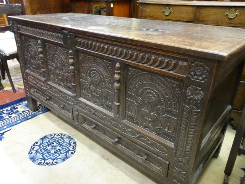 A HEAVILY CARVED LATE 17th/EARLY 18th CENTURY OAK DOWER CHEST, the top half hinged to give partial opening and having two base drawers with a heavily carved front, 160 cms wide