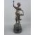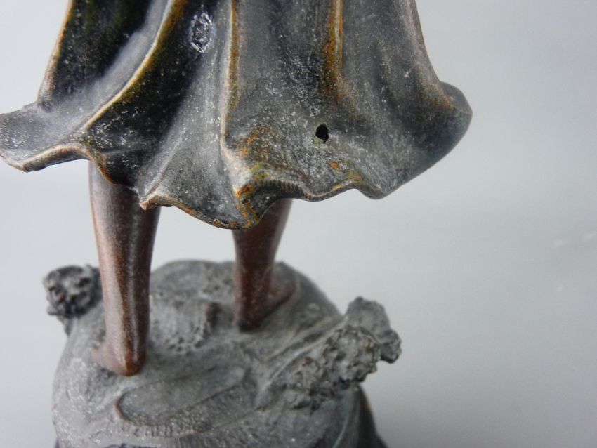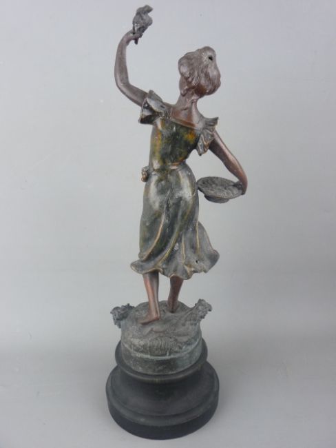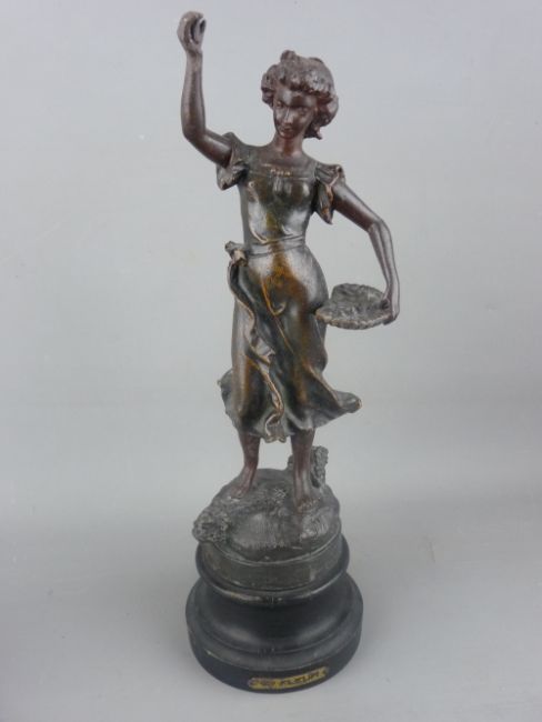 A PAIR OF VICTORIAN SPELTER FIGURINES of young maidens with baskets of flowers on ebonized socle bases, 39 cms high the tallest