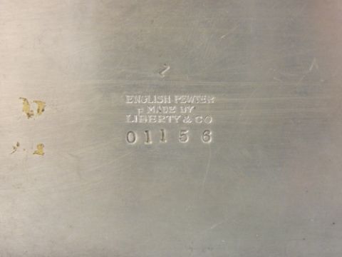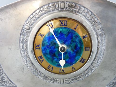 A LIBERTY & CO ENGLISH PEWTER & ENAMEL MANTEL CLOCK, 01156, 18 cms high, 29 cms wide