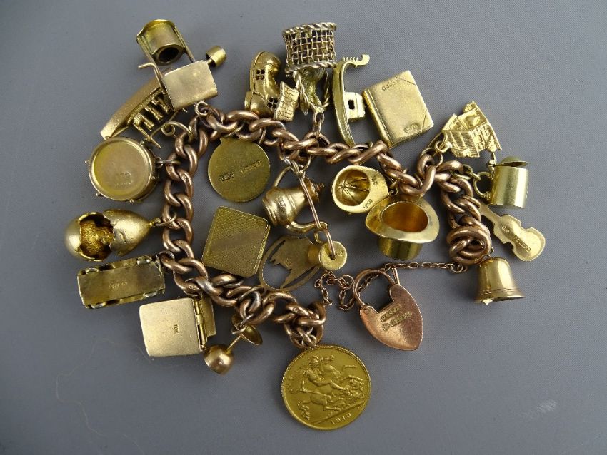 A NINE CARAT GOLD LINK 22 CHARM BRACELET with safety chain and padlock having approximately good charms and a gold half sovereign 1913, 52 grms total