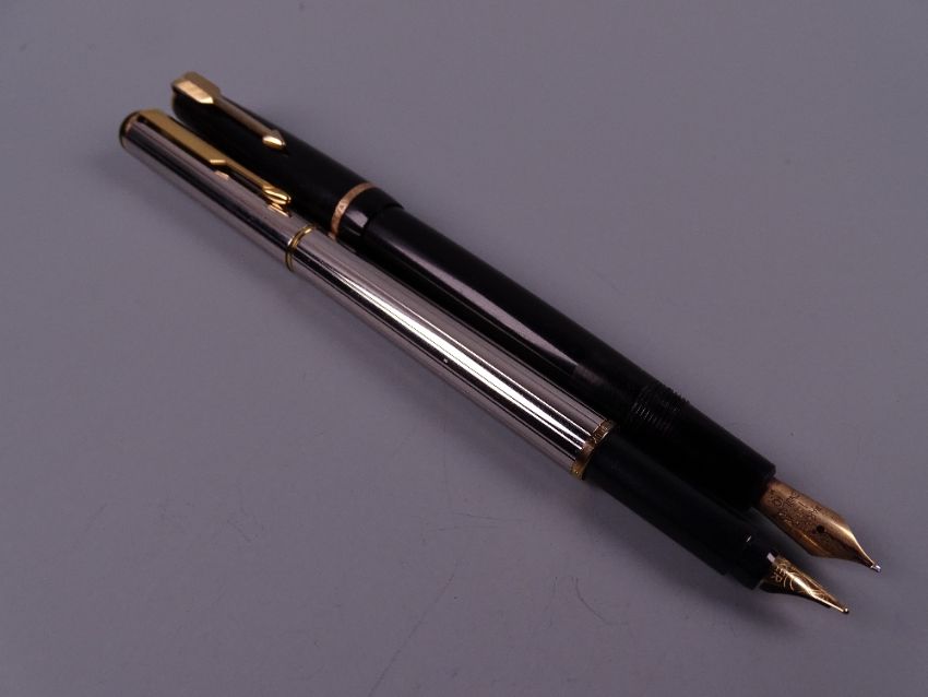 Vintage black Parker Junior fountain pen (14k nib) with gold plated trim (boxed) and a modern silver plated Parker Rialto Corinth fountain pen with gold plated trim, in original box