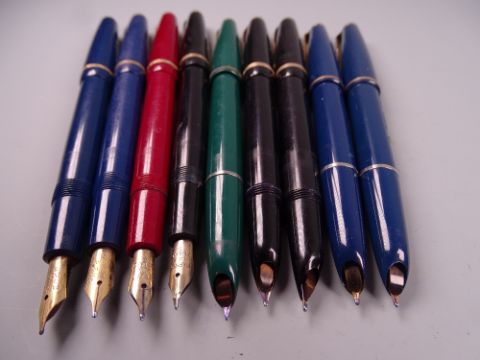 Four Vintage Parker Slimfold fountain pens (one black, two blue, one red), black cap damaged, all with 14k nibs, two Vintage Parker Lady fountain pens and three Parker 17 Lady fountain pens (two black, two blue, one green)