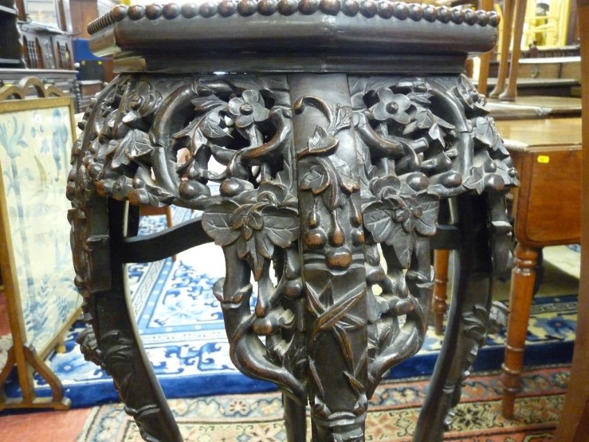 A CHINESE CARVED HARDWOOD MARBLE TOPPED STAND, 90 cms high