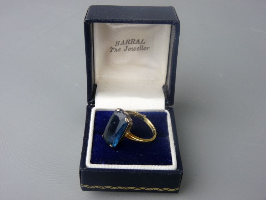 AN EIGHTEEN CARAT GOLD DRESS RING set with a 17mm rectangular blue topaz, ring size 'P', 4.7 grms gross
