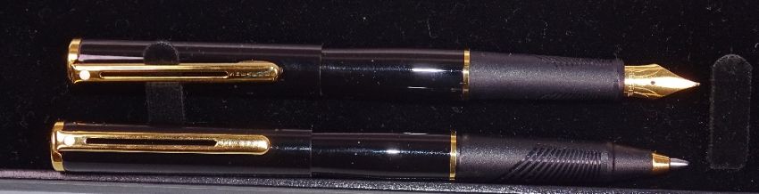 Modern Black Lacquer Sheaffer Agio Compact fountain pen and ballpoint pen set. Modern Brushed chrome Sheaffer Triumph 444 fountain pen in box