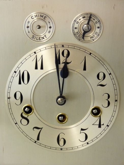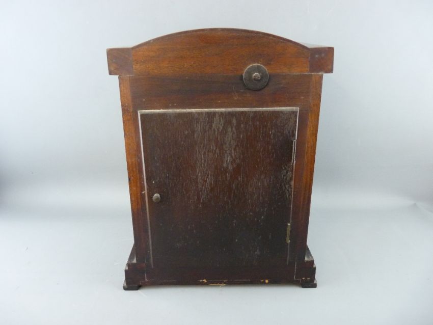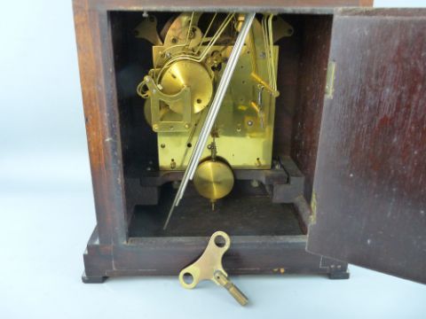 A MAHOGANY ENCASED JUNGHANS MANTEL CLOCK with silvered dial and having an eight day striking movement on the quarter