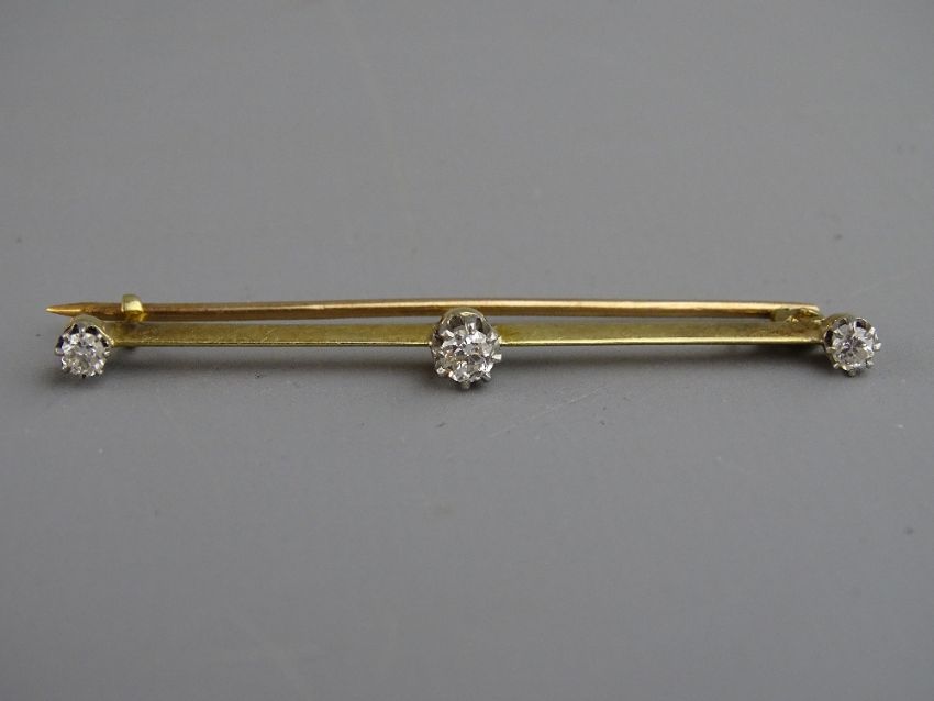 AN UNMARKED GOLD BAR BROOCH having a centre diamond, approximately 0.25 carat and two smaller end diamonds, total weight 3.3 grms