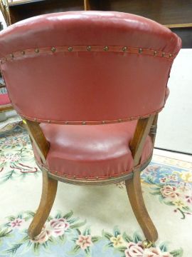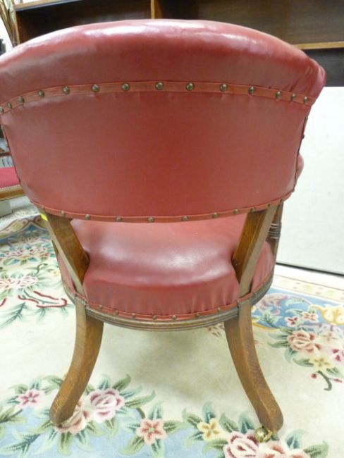 A VINTAGE OAK OFFICE ARMCHAIR with button back upholstery, 84 cms high, 63.5 cms wide, 70 cms deep overall