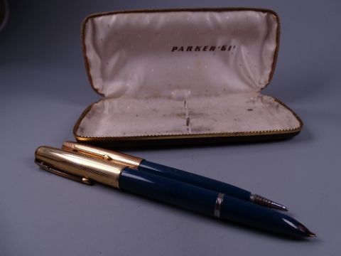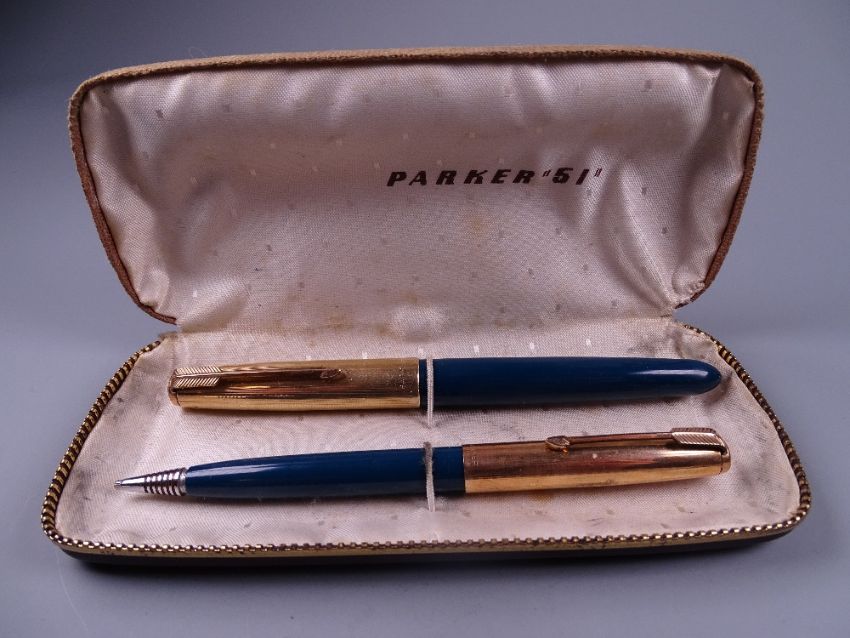 Vintage teal Parker 51 fountain pen and pencil set in original box