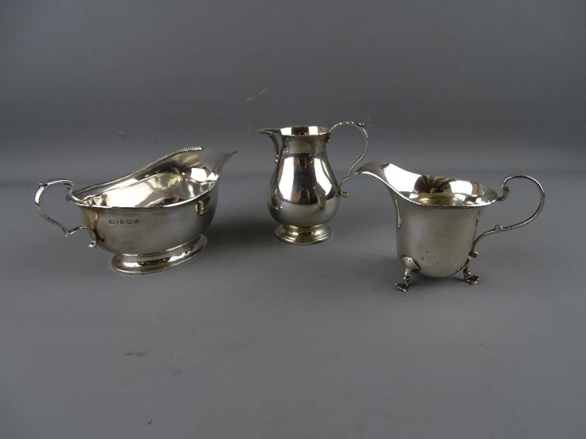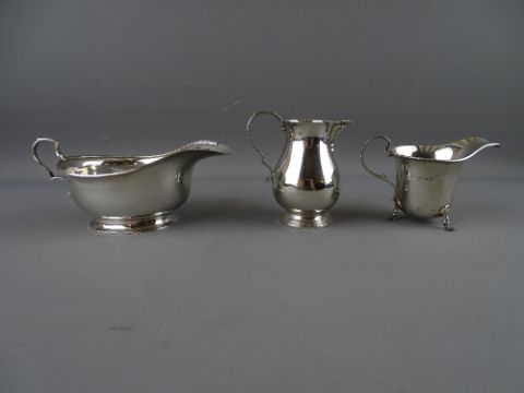 A SILVER SAUCE BOAT, a silver cream jug on hoof feet and one other on a circular base, Birmingham 1918, 1924 and 1962 respectively, 6.9 troy ozs gross
