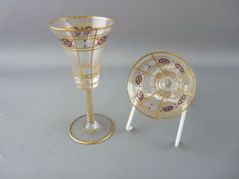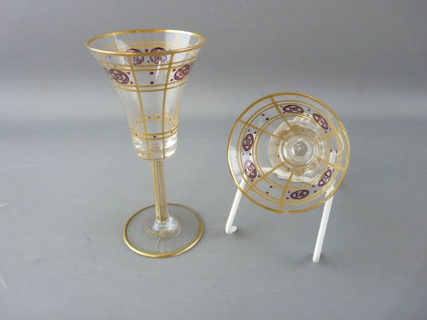 A GOOD ART NOUVEAU STYLE DECANTER & DRINKING GLASS SUITE having a gilt line and McIntosh style decoration comprising twin decanters with stoppers, ten 19.5 cms high wide rim flutes (one chipped), eight 13.5 cms high sherry glasses and eleven 16 cms high cocktail glasses (thirty one)