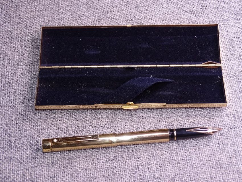 Vintage Imperial brass Sheaffer Targa fountain pen with lacquered brass finish polished to a brilliant shine trimmed with gold plate and fitted with a 14 carat solid gold nib. In original brass case