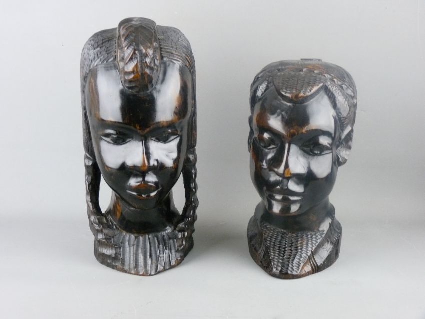 TWO GOOD AFRICAN CARVED WOODEN HEADS, 29 and 24 cms high
