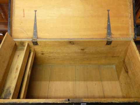 AN ANTIQUE PINE LIDDED CHEST with painted chinoiserie decoration, 51 cms high, 104.5 cms wide, 52 cms deep