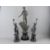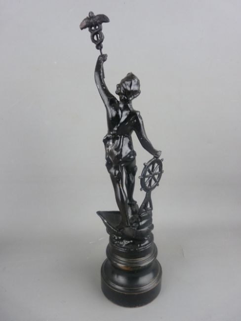 THREE SPELTER FIGURINES, French circa 1900 to include a pair titled 'Le Commerce' and 'L'Industrie', the other as a seed sowing farmhand, all ebonized socle bases, 52 cms high the tallest