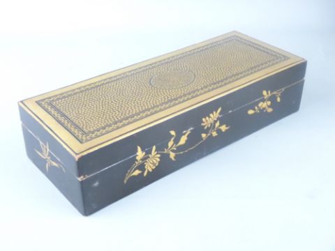 AN ORIENTAL GILT DECORATED SET OF SIX LIDDED BOXES having fine hand painted decoration, 8 cms high, 29 cms long (with knocks and abrasions)
