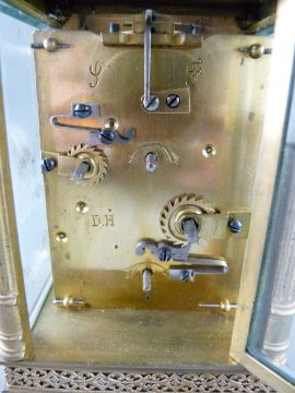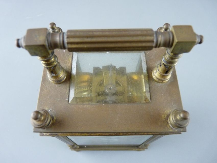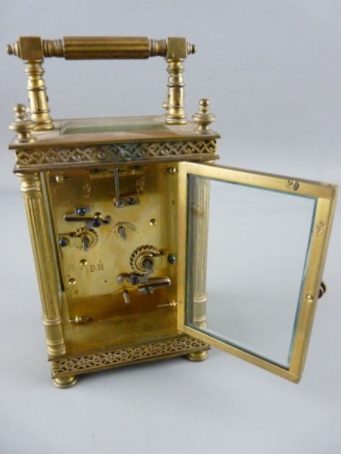 A FRENCH BRASS CASED CARRIAGE CLOCK BY DIETTE HOUR, stamped 'D H', the dial marked 'Lausanne', with lower alarm dial and bell to base, in an architectural brass case, 15.5 cms high handle up, with key