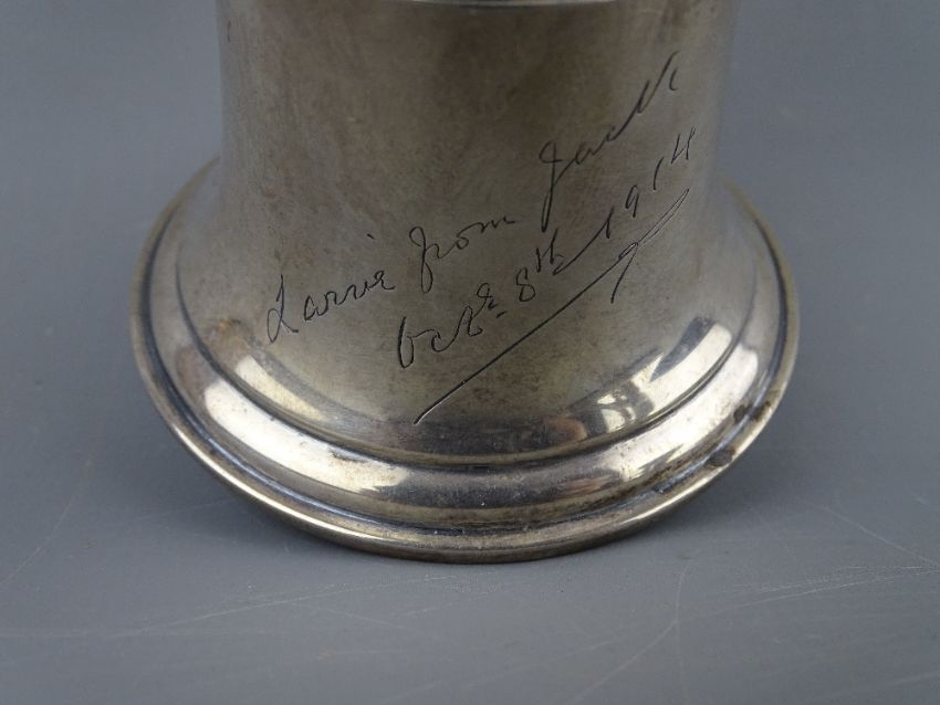 TWO SILVER INKWELLS including a capstan type with tortoiseshell inset lid, Birmingham 1913 and a bell shaped example, Birmingham 1914 with inscription, 5.5 and 7.5 cms high respectively