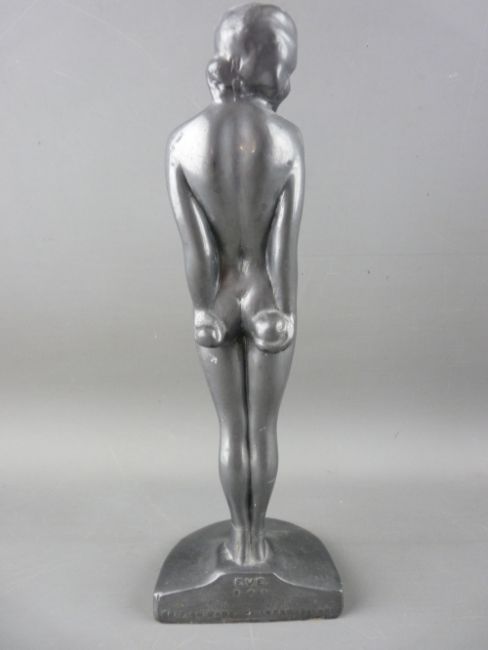 EVE ART DECO PEWTER BOOKENDS stamped 'British Made' with further markings to the back, 24 cms high (fracture to the ankles area of one)