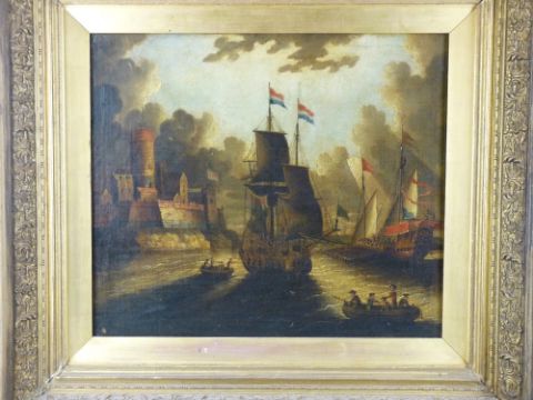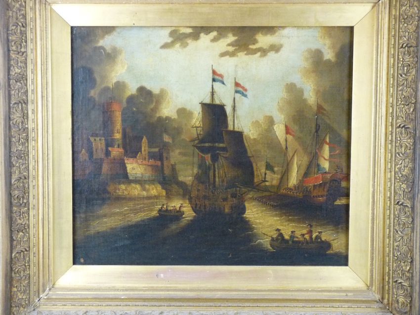 SCHOOL OF VAN DER VELDE OIL ON CANVAS - Continental harbour scene with warships etc, 46 x 54 cms
