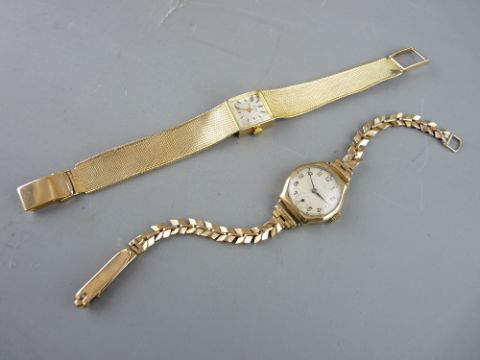 TWO LADY'S NINE CARAT GOLD WRISTWATCHES, one bracelet, one strap, 18.7 grms and 22.5 grms respectively (strap with damages)