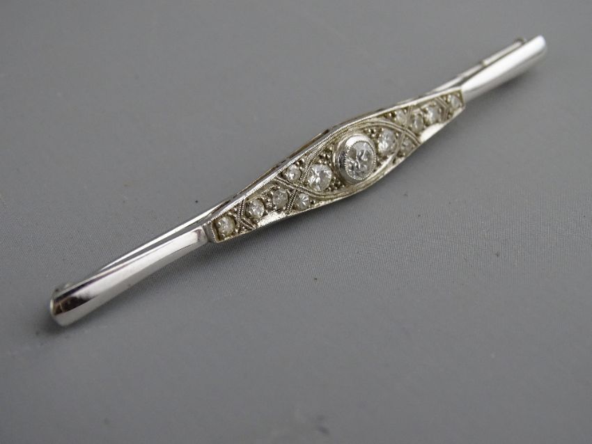 AN EIGHTEEN CARAT PLATINUM BAR BROOCH having a centre round cut diamond, approximately 0.4 carat with surrounding graduated diamonds totalling twelve in all, 5.8 grms total