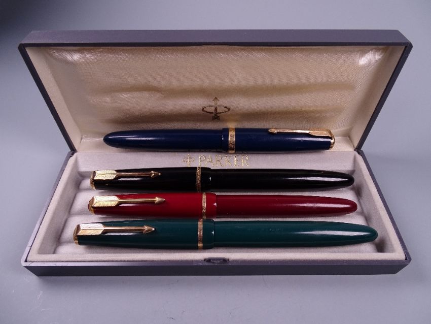 Vintage blue Parker Duofold fountain pen with gold plated trim and 14ct gold nib and three vintage Parker Duofold fountain pens - two Senior (1 black, 1 green) and one Junior (burgundy), all with gold plated trim and 14ct gold nib (in box)