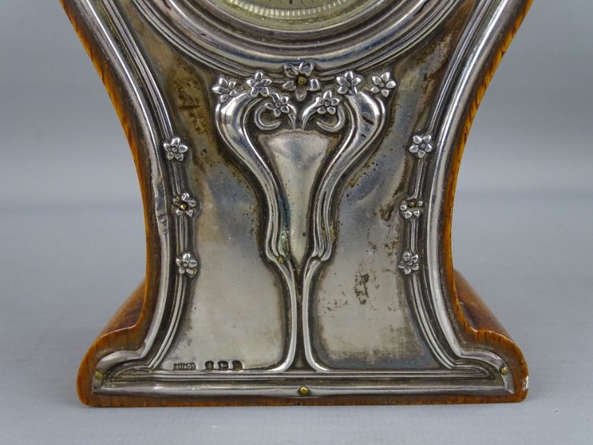 A SILVER FRONTED OAK MANTEL CLOCK in the Art Nouveau style, Birmingham 1909, 15.5 cms high