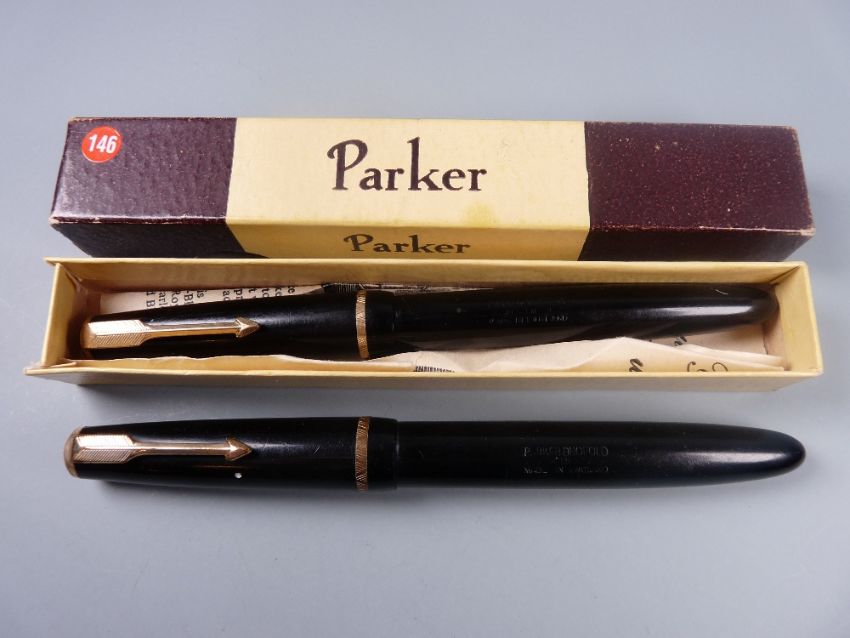 Vintage black Parker Duofold Senior fountain pen with original 14ct gold nib and gold plated trim and a Vintage black Parker Victory fountain pen with 14ct gold nib and gold plated trim, in original box with instructions