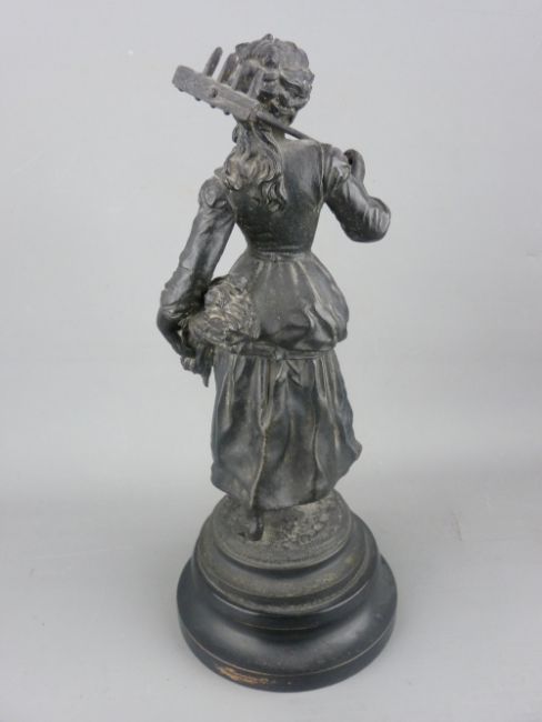 TWO VICTORIAN SPELTER FIGURINES, French on ebonized wooden bases, 45 cms high the tallest