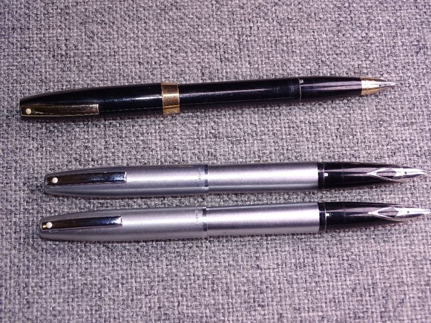 Vintage Black Sheaffer Imperial fountain pen with gold trim, Triumph nib and Touchdown filling mechanism. 2 modern Brushed chrome Sheaffer Triumph 444 fountain pens