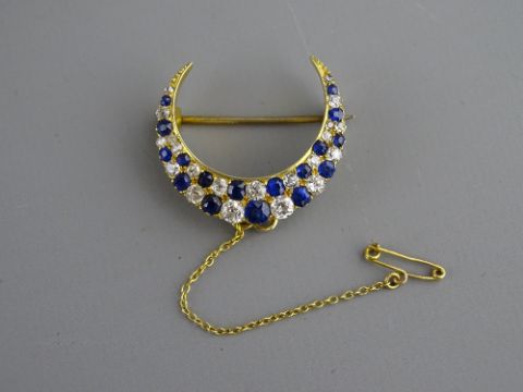 A FINE CRESCENT SHAPED BROOCH encrusted with graduated diamonds from 0.25 down (twenty one in all) interspersed with seventeen graduated round cut sapphires, total weight 6.6 grms