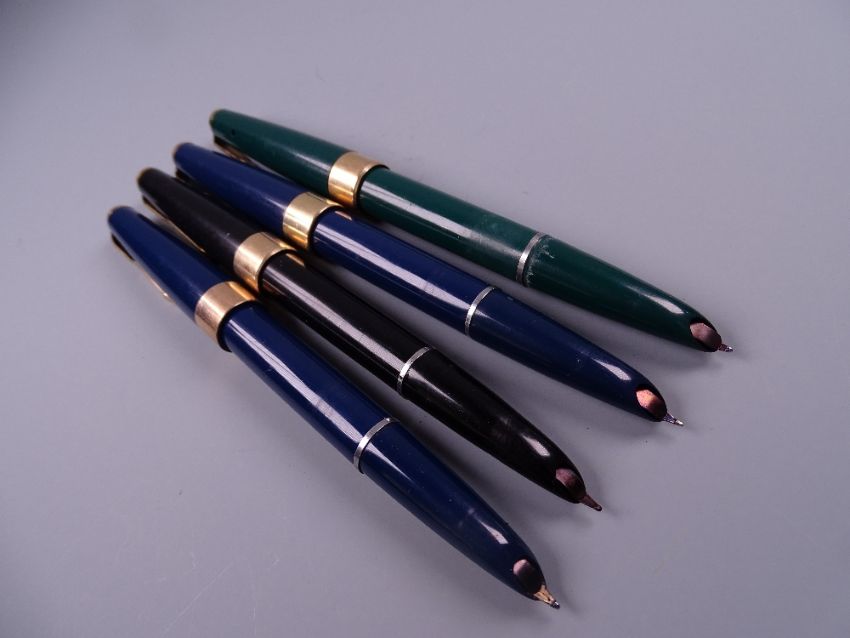 Four Vintage Parker 17 fountain pens - wide gold plated band (one black, two blue, one green)