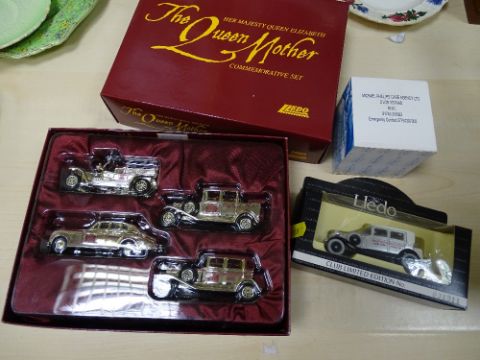 Boxed Queen Mother commemorative diecast vehicle set and another Lledo vehicle