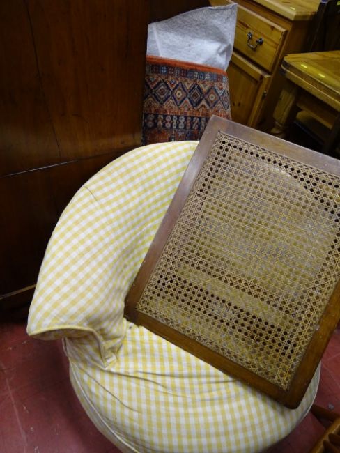 Stylish red and blue patterned rug, tub chair and a folding cane stand