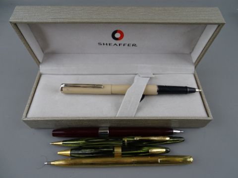 Sheaffer pens - Triumph Crest and Tuckaway propelling pencils, Triumph ballpoint pen, Imperial ballpoint pen and an Agio ballpoint pen (boxed)
