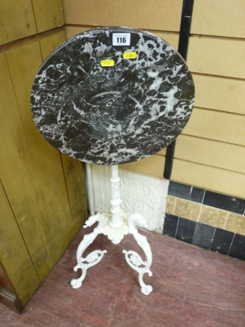 Cast metal ornate circular tripod table with marble top