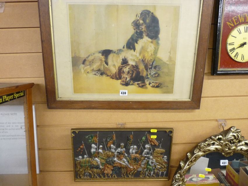 Oak framed print of spaniels and an embossed composition plaque of King Henry V at Agincourt
