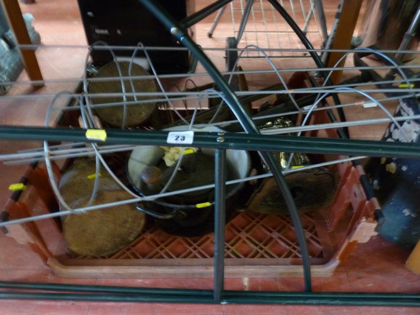 Parcel of items comprising garden arch, metal spiral, garden frames and basket of various items