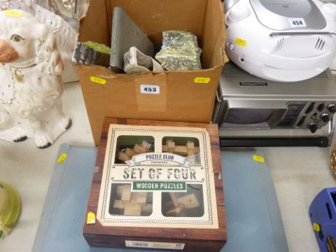 Small quantity of layout scenery, a boxed set of wooden puzzles and a folder full of letter decals and stickers etc