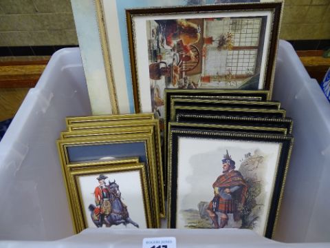 Tub of prints of gentlemen in Scottish tartan and a small oval print of infantry etc