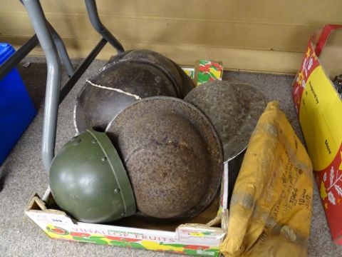 Four vintage military tin hats and one other along with a broad arrow marked inflatable exposure containing suit