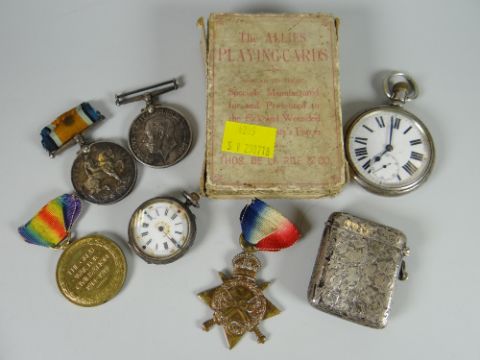 Four WWI medals relating to Lance Corporal M Roberts together with allied playing cards, two pocket watches & a silver vesta caseTwo of the medals read 1219 PTE M Roberts R W FUSThe other reads 28947 PTE J Davies RW FUS