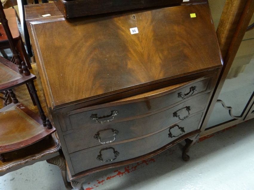 A neat vintage bow fronted drop front bureau with three drawers on cabriole legs