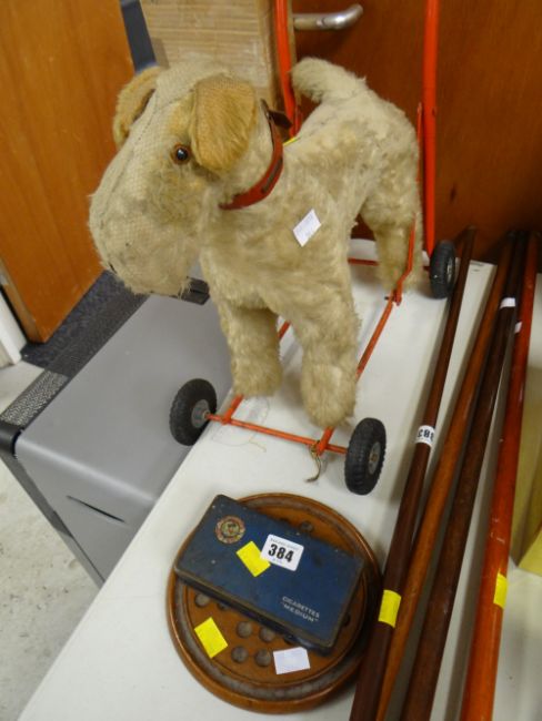 A vintage child's dog walker together with a vintage solitaire set with marbles