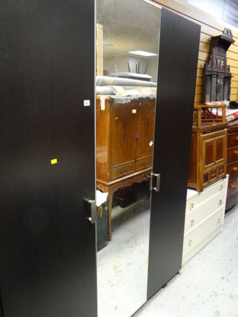 A modern black ash two-door mirror wardrobe together with a modern white three-drawer chest of drawers