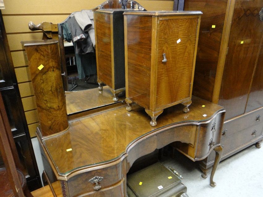 Good mid-twentieth century flame mahogany decorated bedroom suite comprising two-drawer wardrobe, wardrobe with drawer base, dressing table, bedside cabinet, double bed frame & base