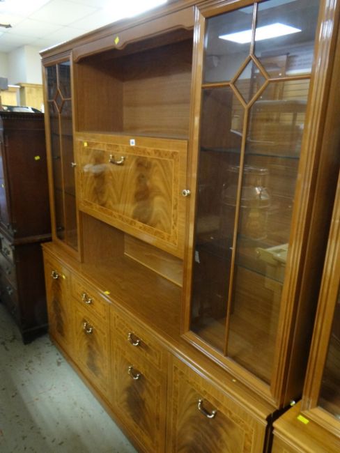 A large modern lightwood & decorated lounge unit, pull down cupboard flanked by glazed display cupboards (matching previous lot)