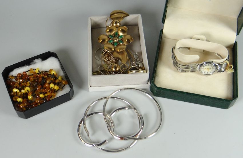 9ct gold signet ring, 9ct gold ladies dress ring, silver pendant, sterling silver brooch, costume jewellery, boxed ladies wristwatch etc