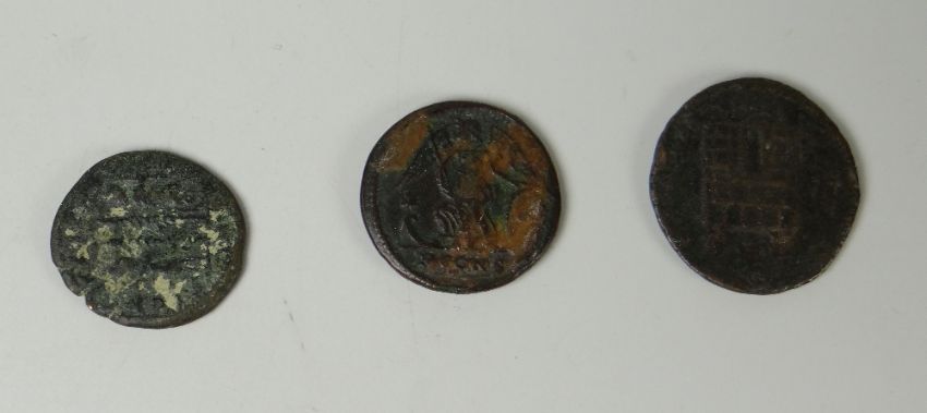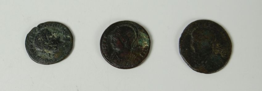 Three Roman coins including one with a head of Constantine
